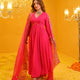 The Shreya Georgette Suit Set exudes sophistication in a rich navy hue. Crafted from plush georgette, the flared Anarkali-style kurta features a scalloped V-neck and intricately embellished flare for added elegance. Paired with matching pants, the ensemble is completed by an embellished dupatta, making it the perfect choice for festive...