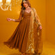 Brighten up your festive wardrobe with the Meera Georgette Suit Set in a vibrant orange hue. Crafted from plush georgette, the flared Anarkali-style kurta features a V-neck and an intricately embellished front yoke with three-quarter sleeves. Paired with matching pants, the set is completed by a dupatta adorned with elegant...